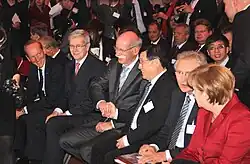 Líderes das principais empresas de construção automóvel com a chanceler alemã Angela Merkel na Nationale Plattform Elektromobilität 2013 em Berlim. Da direita para a esquerda: Neumann (Opel), Varin (ex-PSA), Zetsche (Daimler), Wan Gang (China) |