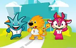 Os mascotes dos Jogos Pan-Americanos de 2011: Gavo, Leo e Huichi, da esquerda para a direita.