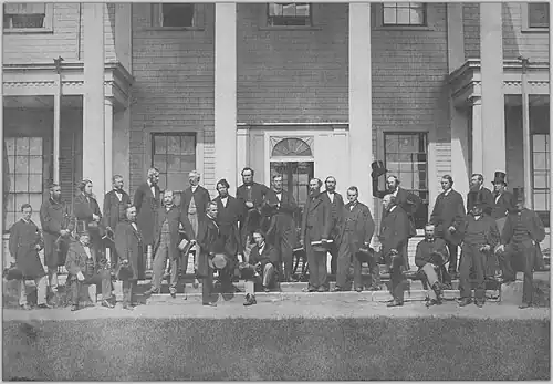 Os delegados da Conferência de Charlottetown em 1864; Macdonald está no centro, sentado nos degraus.