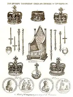 O uso de regalias pelos monarcas na Inglaterra remonta à época em que o país foi convertido ao cristianismo no início da Idade Média. Um conjunto permanente de trajes de coroação, que pertenceu a Eduardo, o Confessor, foi estabelecido depois que ele foi santificado no século XII. Estas relíquias sagradas foram mantidas na Abadia de Westminster, local de coroações desde 1066, e outro conjunto de insígnias foi reservado para festas religiosas e aberturas de Estado do Parlamento. Coletivamente, esses objetos passaram a ser conhecidos como Joias da Coroa. A maior parte da coleção data de cerca de 350 anos atrás, quando Carlos II subiu ao trono. Os trajes medievais e da era Tudor foram vendidos ou derretidos depois que a monarquia foi abolida em 1649, durante a Guerra Civil Inglesa. Apenas quatro itens originais são anteriores à Restauração: uma colher de unção do final do século XII (o objeto mais antigo) e três espadas do início do século XVII. A insígnia continuou a ser usada pelos monarcas britânicos após a fusão dos reinos da Inglaterra e da Escócia em 1707.