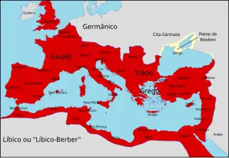 A línguas celtas existentes no início do período imperial incluíam o gaulês, falado na Gália (atualmente França, Bélgica e Suíça); celtibérico, em algumas partes da Hispânia (hoje Portugal e Espanha); o britónico na Britânia; e gálata, um ramo do celta levado para a Anatólia pelas invasões gaulesas do século III a.C. O topónimo grego Galácia deriva de gálatas (galatai), a designação grega de gauleses ou celtas. Há registo de palavras emprestadas do gaulês em latim, as mais antigas de 239–169 a.C., devido à existência de povoados celtas na península Itálica.[81] Na Antiguidade Tardia alguns termos gauleses tinham ficado tão latinizados que a sua origem celta já não era reconhecida.[82]
