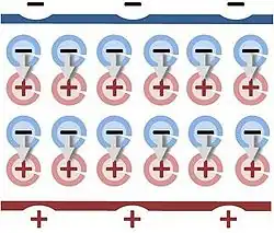 Um dielétrico em presença de um campo elétrico, sofre o que se chama de polarização. A polarização consiste na separação das cargas positivas e negativas desse dielétrico, visto que o campo elétrico acelera cargas positivas no sentido do campo e cargas negativas no sentido oposto. Essas cargas geradas por esse efeito de polarização é o que se chama de cargas ligadas. O material passa a ser constituído de dipolos, como mostrado na figura 6. Dessa forma, as cargas estão "presas" aos dipolos, não estão livres para se mover. Por sua vez, é chamado de carga livre, o restante das cargas, que não foram geradas por esse efeito de polarização. As cargas livres são as cargas com as quais se está mais habituado quando se estuda eletrostática.[3] Desse modo, num dielétrico, a densidade volumétrica de carga pode ser escrita como: