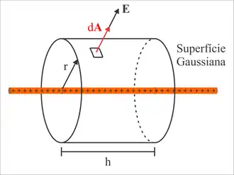 Uma vez que o fio está carregado positivamente e considerando sua simetria cilíndrica, esperamos que o campo elétrico produzido por ele aponte radialmente para fora do fio. Tal característica faz com que o fluxo de campo elétrico seja nulo nos planos da base da superfície gaussiana, isto é, , já que o ângulo entre e é . Na superfície lateral, o diferencial de fluxo passa a ser escrito como , já que o ângulo entre e é . Dessa forma, sendo a área lateral da superfície gaussiana, temos que (onde SL significa Superfície Lateral):
