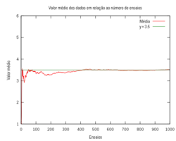 Embora nenhum lado tenha o número 3,5 e nenhum lance resulte no valor 3,5, a LGN determina que a média dos lances de um dado não viciado de seis lados irá se aproximar cada vez mais de 3,5 depois de um grande número de jogadas. Em outras palavras, a soma do resultado particular (1, 2, 3, 4, 5 ou 6) de cada lance irá se aproximar cada vez mais de um sexto do número total de jogadas.[5]