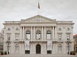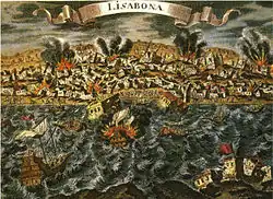 Lisboa foi quase na totalidade destruída a 1 de Novembro de 1755 por um terrível sismo.[93] Foi reconstruída segundo os planos traçados pelo Marquês de Pombal, Ministro da Guerra e Negócios Estrangeiros. Oriundo da baixa nobreza, depressa reagiu perante as ruínas do sismo logo depois de ter dito ser necessário enterrar os mortos, cuidar dos vivos e reconstruir a cidade. A parte central reconstruída terá o nome de Baixa Pombalina. A quadrícula adoptada nos planos de reconstrução permitiria desenhar as praças do Rossio e Terreiro do Paço, esta com uma belíssima arcada aberta em frente do rio Tejo.[94] Ainda no século XVIII e a instâncias de D. João V, o papa concedeu ao arcebispo da cidade o título honorífico de patriarca e a nomeação automática como cardeal (daí o título de "Cardeal Patriarca de Lisboa").[95]