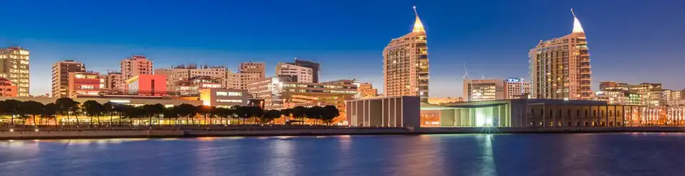 Panorama urbano de Lisboa a partir do Miradouro da Graça com a Ponte 25 de Abril e o Cristo Rei ao fundo Torre Vasco da Gama (esquerda) no Parque das Nações e Ponte Vasco da Gama (ao fundo) | |