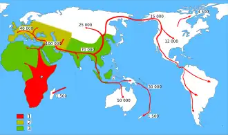 A evolução migratória do Homo sapiens, ocorreu na África Oriental há entre 190.000 e 160.000 anos, onde, tudo leva a crer, se desenvolveu a primeira anatomia humana moderna. É também provável que o Homo sapiens, depois se espalhou para o leste do Mediterrâneo em torno de há 100.000 a 60.000 anos,[3] e pode ter chegado à atual China há 80.000 anos,[4] e daí para a Austrália e, posteriormente, chegou as Américas. Atualmente os seres humanos estão distribuídos em toda a Terra, principalmente nos continentes e ilhas do planeta.
