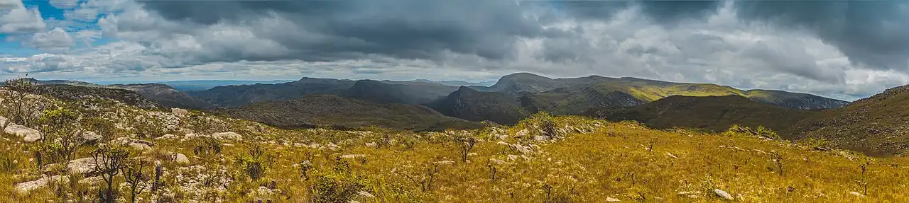 Mais de 90% do território mineiro está acima de 300 m de altitude, quase 60% do mesmo acima dos 600 m e 20% entre 900 e 1500 m de altitude,[41][59] tendo predominância de planaltos com escarpas e depressões, mais notáveis na região central.[60] O ponto mais alto do estado é o Pico da Bandeira, situado na divisa com o Espírito Santo, com 2 891 metros de altitude (o terceiro maior do país), seguido pelo Pico do Cristal com 2 780 metros.[58] Além da Serra do Caparaó, onde está o pico da Bandeira, outros maciços montanhosos merecem destaque no território mineiro, dentre eles a Serra do Espinhaço, que segue do centro em direção ao norte do estado até o limite com a Bahia. Ao sul, delimitando a fronteira com os estados de São Paulo e Rio de Janeiro, está a Serra da Mantiqueira na qual se situam alguns dos mais altos picos do país, como o Agulhas Negras com 2 787 metros de altitude. Outras cadeias montanhosas de menor porte espalham-se por todo o estado, dentre as mais notáveis a Serra da Canastra e do Lenheiro.[61]