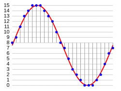 No diagrama, uma onda sinusoidal (curva vermelha) é amostrada e quantizada para modulação por código de pulso. A onda sinusoidal é amostrada em intervalos regulares, mostrado como tiques no eixo dos xx. Para cada amostra, um dos valores disponíveis (tiques no eixo dos yy) é escolhido por algum algoritmo. Este produz uma representação totalmente discreta do sinal de entrada (área sombreada) que pode ser facilmente codificada como dados digitais para armazenamento ou manipulação. Para a onda sinusoidal à direita, podemos verificar que os valores quantizados em momentos de amostragem são 7, 9, 11, 12, 13, 14, 14, 15, 15, 15, 14, etc. Codificando esses valores em números binários resultaria no seguinte conjunto de nibbles: 0111 (23.0+22.1+21.1+20.1=0+4+2+1=7), 1001, 1011, 1100, 1101, 1110, 1110, 1111, 1111, 1111, 1110, etc. Estes valores digitais podiam assim ser mais processados ou analisados por um processador de sinais. Vários fluxos PCM podiam também ser multiplexados num maior agregado de fluxo de dados, geralmente para transmissão de múltiplos fluxos numa única ligação física. Uma técnica é chamada de multiplexação por divisão de tempo, em inglês time-division multiplexing (TDM) e largamente usada, notavelmente no moderno sistema de telefone público.