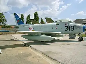 North American F-86 (5319) Sabre junto a um A7-P Corsair (camuflado) e um Northrop T-38 Talon (Branco) no polo de Alverca do Museu do Ar - Alverca do RibatejoBloco 1 construídos 78, modelo NA-172 n.ºs de cauda: 51-2850 a 51-2927, equipados com motor J47-GE-27 .