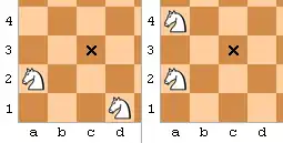 Se as peças estão em linhas e colunas diferentes, o método (1) é preferível. Por exemplo, com dois cavalos em a2 e d1, qualquer um dos dois poderia se mover para c3, a jogada é indicada como Cac3 ou Cdc3, conforme for apropriado. Com dois cavalos em a2 e a4, as jogadas serão C2c3 ou C4c3, conforme for apropriado. Como visto acima, um x pode ser usado para indicar uma captura: por exemplo, C4xc3. Talvez seja necessário identificar uma peça de saída com tanto sua coluna quanto linha em configuração incomum (ex.: o jogador tem três rainhas ou três cavalos no tabuleiro).[4]