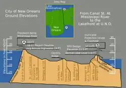 Nova Orleans está localizado na região de menor altitude de todo o estado de Luisiana, bem como está localizada em uma das regiões de menor altitude de todo o Estados Unidos, perdendo apenas para o Vale da Morte e para o Mar Salton. Muito da cidade está localizada entre 30 centímetros a três metros abaixo do nível do mar. Isto torna a região altamente vulnerável a enchentes e inundações. Para tentar minimizar o risco de enchentes na região, um total de 112 grandes bombas d' água são usadas, capazes de bombear mais de 95 bilhões de litros de água por dia. Porém, basta apenas quatro centímetros de precipitação, causada por uma grande tempestade ou um furacão, para que maior inundação possa ocorrer. Neste caso, as bombas-d'água não removem água suficiente, e a sedimentação do solo da cidade e os diques atuam como um imenso reservatório de água, suficiente para formar um lago artificial que pode ter até nove metros de profundidade. Por causa disto, a maioria dos cemitérios da cidade usam sepulturas não subterrâneas.