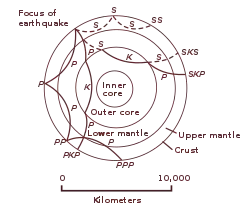 Quando ocorre um sismo, os sismógrafos situados perto do epicentro, até uma distância angular de 105º, conseguem detectar as ondas P e S, mas aqueles situados a distâncias angulares maiores não conseguem detectar as ondas S. Isto deve-se ao facto de as ondas S não poderem atravessar líquidos. Foi este facto que levou Oldham a sugerir que a Terra possuía um núcleo líquido.