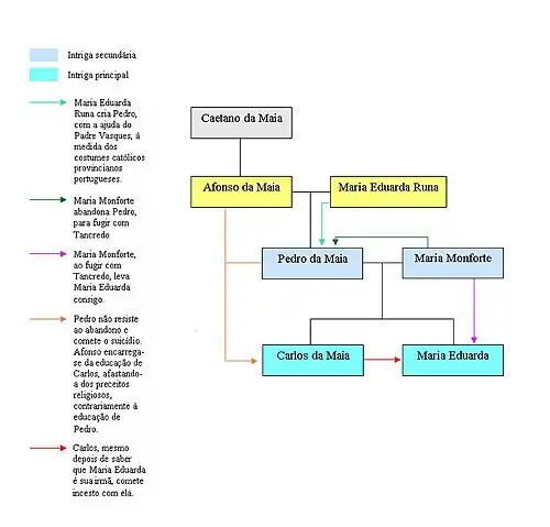 Afonso da Maia, senhor da casa, casou-se com Maria Eduarda Runa e deste casamento resultou apenas um filho - Pedro da Maia. Pedro da Maia, que teve uma educação tipicamente romântica, era muito ligado à mãe e após a sua morte ficou inconsolável, tendo só recuperado quando conheceu uma mulher chamada Maria Monforte, com quem casou, apesar de Afonso não concordar. Deste casamento resultaram dois filhos: Carlos Eduardo e Maria Eduarda. Algum tempo depois, Maria Monforte apaixona-se por Tancredo (um príncipe napolitano, italiano que Pedro fere acidentalmente num acidente de caça e acolhe em sua casa) e foge com ele para Itália, levando consigo a filha, Maria Eduarda. Quando sabe disto, Pedro, destroçado, vai com Carlos para casa do pai, Afonso, onde comete suicídio. Carlos fica na casa do avô, onde é educado à inglesa (tal como Afonso gostaria que Pedro tivesse sido criado).