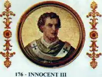 Inocêncio III (em latim: Innocentius III), nascido Lottario dei Conti di Segni; (Gavignano, 22 de fevereiro de 1161 — Perúgia, 16 de julho de 1216) foi o 176.º Papa da Igreja Católica de 8 de janeiro de 1198 até a data de sua morte. Lottario nasceu na família nobre dos Condes de Segni, feudo localizado nos Estados Papais, e estudou nas mais importantes universidades de sua época; Teologia na Universidade de Paris e Direito na Universidade de Bolonha. Aos 21 anos tornou-se um clérigo importante em Roma, e escreveu dois livros notáveis: De Miseria Condicionis Humane “(Sobre a miséria da condição humana)” e De missarum mysteriis “(Sobre o mistério da missa)”. Sendo considerado jovem, forte, erudito, inteligente e hábil foi eleito Papa em 1198, com apenas 37 ou 38 anos de idade.[1] É notoriamente reconhecido como o Papa mais poderoso da história.