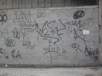No geral, assinaturas pessoais, conhecidas também como tag, declarações de amor ou eventualmente frases de protesto ou insulto. Também utilizada como forma de demarcação de territórios entre grupos – às vezes gangues rivais.