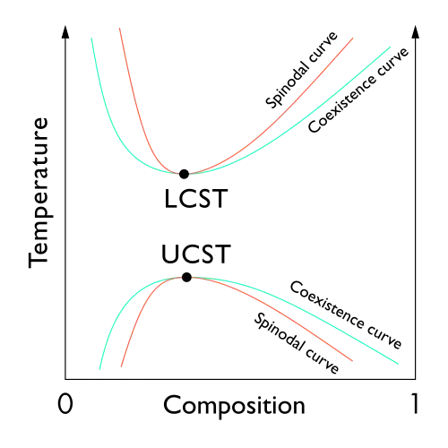 O ponto crítico líquido-líquido de uma solução, o que ocorre a uma temperatura crítica da solução, ocorre no limite da região de duas fases no diagrama de fases. Em outras palavras, é o ponto no qual uma mudança infinitesimal em alguma variável termodinâmica (tais como a temperatura ou a pressão), conduzirá a separação da mistura em duas fases líquidas distintas, como se mostra no diagrama de fases do polímero-solvente à direita. Existem dois tipos de pontos críticos líquido-líquido, que são a temperatura de solução crítica superior , em inglês (UCST), representa o ponto mais quente na qual o arrefecimento irá induzir a separação de fases, e a temperatura de solução crítica inferior, em inglês (TCIS), que é o ponto mais frio no qual o aquecimento irá induzir a separação de fases.