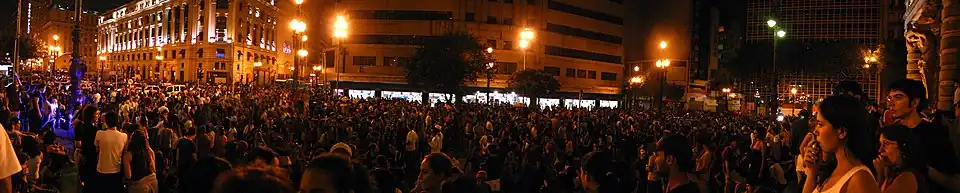 Em 27 de novembro de 1983, São Paulo foi palco pela primeira vez das Diretas Já, um movimento que reuniu milhares de pessoas em frente ao estádio do Pacaembu e que reivindicava a volta das eleições diretas para Presidente da República.[91][92] A cidade voltaria a ser palco do movimento outras duas vezes em 1984, a primeira no dia 25 de janeiro[92][93] e a segunda em 16 de abril, em um ato que reuniu cerca de 1,5 milhão de pessoas.[94]