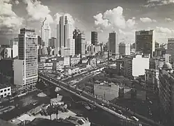 Em 1947, São Paulo ganha sua primeira rodovia asfaltada: a Via Anchieta (construída sobre o antigo traçado do Caminho do Padre José de Anchieta), liga a capital ao litoral paulista. Na década de 1950, São Paulo era conhecida como A cidade que não pode parar e como A cidade que mais cresce no mundo.[84] Em 1953, ocorre a primeira eleição direta para a prefeitura da cidade, sendo eleito o candidato Jânio Quadros.[85] São Paulo realizou uma grande comemoração, em 1954, do "Quarto Centenário" de fundação da cidade. É inaugurado o Parque do Ibirapuera, lançados muitos livros históricos e descoberta a nascente do rio Tietê em Salesópolis. Com a transferência, a partir da década de 1950, de parte do centro financeiro da cidade que fica localizado no centro histórico (na região chamada de ("Triângulo Histórico"), para a Avenida Paulista, as suas mansões foram, na sua maioria, substituídas por grandes edifícios.[84]