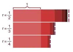 Exemplo 2: A série é convergente, pode-se concluir isso ao calcular a razão que resulta no número real . Logo, trata-se de uma série geométrica com , e .