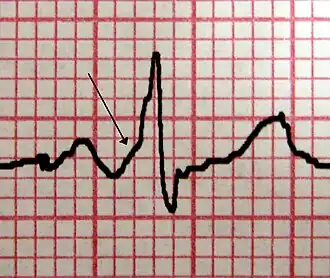 A onda delta (apontada pela seta) é um achado característico do eletrocardiograma de pacientes com Síndrome de Wolff-Parkinson-White.