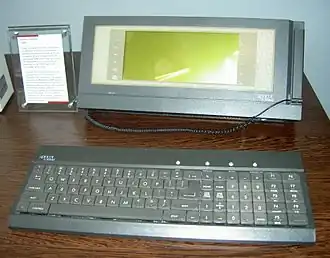 Um microcomputador Apricot, de 1984, o qual já possuía limitada capacidade de síntese de fala.