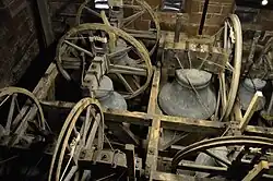 Sinos pendurados para o toque do círculo completo são girados através de um círculo completo da boca para cima. Um suporte (o poste de madeira visto saindo quando os sinos estão abaixados) aciona um mecanismo para permitir que o sino descanse logo após seu ponto de equilíbrio. A corda é presa a um lado de uma roda para que uma quantidade diferente de corda seja enrolada para dentro e para fora enquanto balança para frente e para trás. Os sinos são controlados por toques (um para um sino) em uma câmara abaixo, que giram o sino para um círculo completo e para trás, e controlam a velocidade de oscilação quando o sino está com a boca para cima no ponto de equilíbrio quando pouco esforço é necessário.[9][10][11]