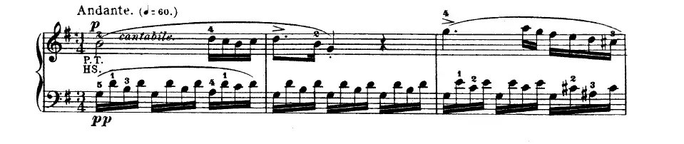 Assim como na sonata anterior, o primeiro movimento vem com a indicação "quasi una fantasia". Uma melodia melancólica é apresentada acompanhada por um ostinato que dura o movimento inteiro. Beethoven coloca no início da partitura uma indicação de "senza surdina". Os desavisados pensam que a "surdina" se refere ao pedal esquerdo do piano, o "una corda", mas na verdade a "surdina" a que Beethoven se refere é o pedal direito. Nos pianos da época de Beethoven, o pedal direito levantava os abafadores (surdinas) das cordas. Ou seja, Beethoven pretendia que o movimento inteiro fosse tocado sem nenhuma surdina nas cordas (com o pedal direito abaixado). Como os pianos modernos não permitem isso - o nível de projeção é muito maior do que o piano da época de Beethoven, criando dissonâncias indesejadas - essa indicação serve como parâmetro para interpretação e não deve ser levada à risca (a não ser que o pianista toque num piano de época). O movimento tem uma forma-sonata um pouco escondida, onde há uma exposição, desenvolvimento e recapitulação, mas a forma fica bem diluída no contexto geral. Assim como na sonata anterior, Beethoven coloca um "attacca subito" no final do movimento para dar continuidade à música.