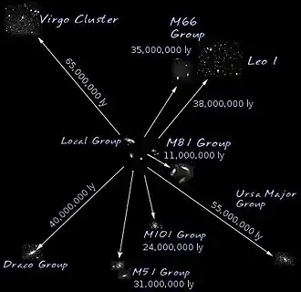 ![]() Distâncias do Grupo Local para grupos e aglomerados selecionados dentro do Superaglomerado Local | |