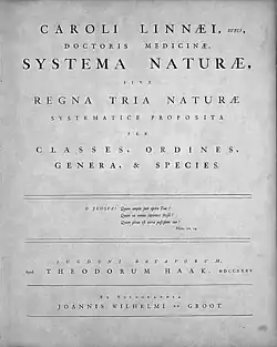 - ↑ Linnaeus, C. (1735) Systema naturae, sive regna tria naturae systematice proposita per classes, ordines, genera, & species. Haak, Leiden