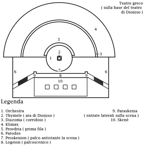 - a orquestra (orkhestra, provém do verbo ὀρκέομαι, orkeomai, que significa dançar, indicava, na verdade, o local do antigo teatro onde as pessoas dançavam), circular, colocado entre o piso inferior do auditório e o palco, é o espaço central do teatro grego, aquele que está reservado ao coro. No centro localizava-se o altar de Dioniso (timele).