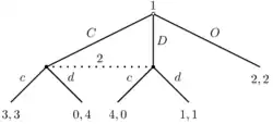 A forma extensiva também pode capturar jogos que se movem simultaneamente. Isto pode ser representado com uma linha tracejada ou um círculo que é desenhado contornando dos diferente vértices (isto é, os jogadores não sabem a qual ponto eles estão).