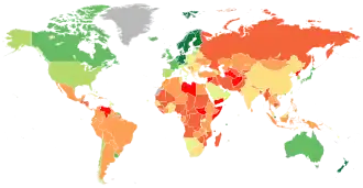 O CPI de 2020, publicado em janeiro de 2021, atualmente classifica 180 países "em uma escala de 100 (muito limpo) a 0 (altamente corrupto)" com base na situação entre maio de 2019 e maio de 2020.[19] Na lista, Dinamarca, Finlândia, Nova Zelândia, Suécia, Singapura e Suíça são percebidos como os 6 países menos corruptos do mundo, com uma classificação consistentemente alta entre a transparência financeira internacional, enquanto o país mais percebido como corrupto no mundo é a Somália, pontuando 8–10 de 100 desde 2012.[20] O Sudão do Sul também é percebido como um dos países mais corruptos do mundo devido às constantes crises sociais e econômicas, obtendo uma pontuação média de 13 em 100 em 2018.[21]
