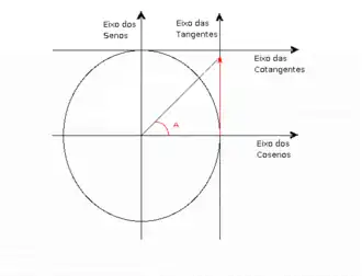 No círculo trigonométrico, o valor da tangente de um ângulo qualquer pode ser visualizado na reta vertical que tangencia este círculo no ponto em que ele corta o eixo horizontal do lado direito. Nesta reta tangente ao círculo trigonométrico, o valor da tangente trigonométrica de qualquer ângulo é representado pelo segmento que vai do ponto em que ela corta o eixo horizontal até o ponto em que ela corta a reta que contém o raio do círculo trigonométrico para o ângulo considerado. Para avaliar este valor, deve-se compará-lo com o raio do círculo trigonométrico que, por definição, é igual a 1, de preferência quando este raio se encontra sobre a parte superior do eixo ortogonal vertical. Observe que, enquanto o seno e o cosseno são sempre menores do que o raio do círculo trigonométrico e, portanto, menores do que 1, a tangente trigonométrica pode ser tanto menor quanto maior do que 1.