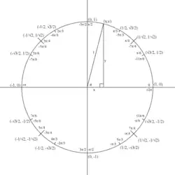 Até então, as funções trigonométricas tem sido definidas por ângulos entre 0 e 90 graus (0 e π/2 radianos) apenas. Usando um círculo unitário, pode-se estendê-los para todos argumentos positivos e negativos (veja função trigonométrica).