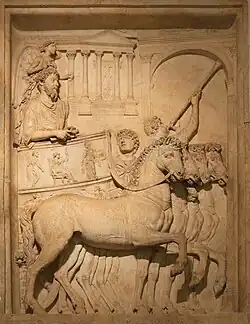 Na República Romana, conquistas militares excepcionais mereciam as mais altas honras possíveis, que ligava o vir triumphalis ("homem do triunfo", mais tarde conhecido como um triunfador)[1] ao passado mítico e semi-mítico de Roma. Com efeito, o general estava perto de ser "rei por um dia" e, possivelmente, perto da divindade. Ele usava a regalia tradicionalmente associada tanto com a antiga monarquia romana e com a estátua de Júpiter Capitolino: a "toga picta" roxa e dourada, coroa de louros, botas vermelhas e, mais uma vez, possivelmente, o rosto pintado de vermelho da suprema divindade de Roma. Ele era levado em procissão pela cidade, em uma carruagem de quatro cavalos, sob o olhar de seus pares e uma multidão aplaudindo, ao templo de Júpiter Capitolino. Os despojos e cativos de suas vitórias abriam o caminho; seus exércitos seguiam atrás. Uma vez no templo Capitolino, ele sacrificava dois bois brancos a Júpiter e colocava símbolos de sua vitória aos seus pés, dedicando sua vitória ao senado romano, pessoas e deuses.[nt 1]