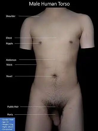 Em humanos a maioria dos órgãos críticos está alojada dentro do torso. Na parte superior do tórax, o coração e os pulmões são protegidos pela caixa torácica,[12] e o abdômen contém a maioria dos órgãos responsáveis pela digestão: o estômago, que decompõe os alimentos parcialmente digeridos via ácido gástrico; o fígado, que produz respectivamente a bile necessária à digestão; os grandes e pequenos intestinos, que extraem os nutrientes dos alimentos; o ânus, do qual os resíduos fecais são eliminados; o reto, que armazena fezes; a vesícula biliar, que armazena e concentra a bile; os rins, que produzem urina, os ureteres, que a passam para a bexiga para armazenamento; e a uretra, que excreta a urina e, no homem, passa os espermatozoides pelas vesículas seminais. Finalmente, a região pélvica abriga os órgãos reprodutores masculino e feminino.[13][10][14]