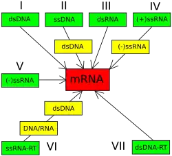 Como mencionado anteriormente, o Sistema de Classificação de Baltimore foi criado com base nos diferentes mecanismos de transcrição que os vírus adotam para sintetizar mRNA a partir dos seus variados tipos de material genético. Os vírus podem ter genoma constituído por dsDNA, ssDNA, dsRNA, ssRNA, além de alguns serem capazes de realizar a transcrição reversa (ssRNA-RT e dsDNA-RT).[4] Outra propriedade notável dos ácidos nucleicos virais é a polaridade (sentido, ou senso) das fitas de DNA e RNA. Fitas senso positivo (+) apresentam sequência idêntica à do mRNA, enquanto as senso negativo (-) apresentam sequência nucleotídica complementar. Diante desta complexidade de características, as estratégias de transcrição do genoma viral são tão variadas quanto os mecanismos de entrada, e podem envolver mais de uma etapa, as quais levam à conversão da informação genética viral em mRNA.[5]