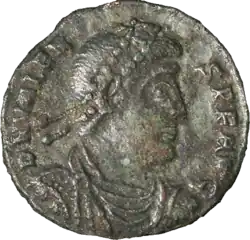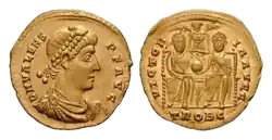 ![]() Soldo cunhado por Valente em c. 376. No reverso, Valente e seu irmão Valentiniano sustentam o Globus cruciger, símbolo de poder. | |