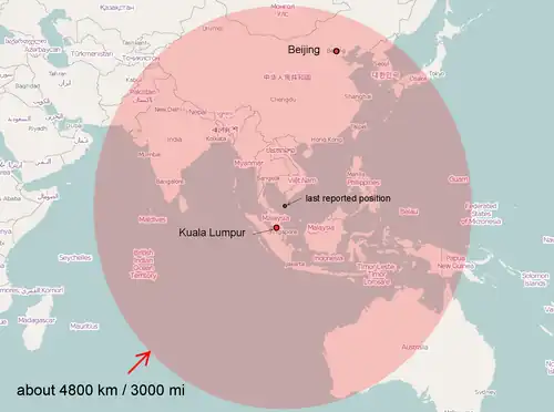 A Força Aérea da Malásia informou, após fazer leituras de seus radares, que o avião mudou sua rota durante o voo, indo para a direção oeste e se desviando assim da rota prevista entre Kuala Lumpur e Pequim.[31]