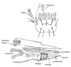 As Quelíceras em Acari são órgãos primários para aquisição de comida, usualmente adaptadas para mastigação, perfuração, dilaceração e sucção. Quanto à movimentação das quelíceras, a redução é mediada por músculos retratores que saem da parede dorsal do gnatossoma, enquanto a sua extrusão é guiada por pressão hidrostática gerada pela contração dos fortes músculos dorsoventrais idiossomáticos. A variação na morfologia da quelícera entre e dentro os grupos de Acari reflete na grande diversidade de hábitos alimentares e modos de vida da subclasse.