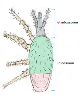 O corpo dos Acari se divide em duas regiões principais: o Gnatossoma, ou Capítulo e o Idiossoma. Essa divisão ocorre unicamente neste grupo, sendo apontada diversas vezes como a sinapomorfia do clado.[1]