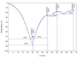 Temperatura de fusão em função da concentração de HCl na água[32][33]