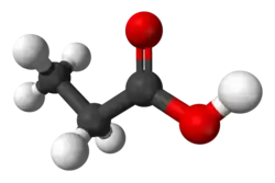 O nome usual ácido propiônico é de origem grega: pro (primeiro), pion (graxo, gordura).