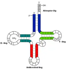 As moléculas de RNA transportador / RNA de transferência (RNAt) também são sintetizadas a partir de segmentos de DNA presentes em certas regiões específicas dos cromossomos. Esse tipo de RNA é chamado de transportador por ser o responsável pelo transporte das moléculas de aminoácidos até os ribossomos, onde elas se unem para formar as proteínas. Um RNAt é uma molécula relativamente pequena. Em uma das extremidades liga-se um aminoácido específico; em sua região mediana há uma trinca de bases, o anticódon. Por meio do anticódon, o RNAt emparelha-se temporariamente a uma trinca de bases complementares do RNA mensageiro (RNAm), o códon.