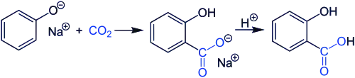 O salicilato de sódio é comercialmente preparado por tratar fenóxido de sódio com uma alta pressão de dióxido de carbono a alta temperatura via a reação de Kolbe-Schmitt. A acidificação da solução do produto dá o ácido salicílico: