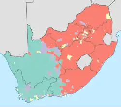África do Sul, oficialmente República da África do Sul e mais raramente referida como Suláfrica,[8][9] é um país localizado no extremo sul da África, entre os oceanos Atlântico e Índico,[10] com 2 798 quilômetros de litoral.[11][12] É limitado pela Namíbia, Botsuana e Zimbábue ao norte; Moçambique e Essuatíni a leste; e com o Lesoto, um enclave totalmente rodeado pelo território sul-africano.[13] O país é conhecido por sua biodiversidade e pela grande variedade de culturas, idiomas e crenças religiosas. A Constituição reconhece 11 línguas oficiais.[10] Duas dessas línguas são de origem europeia: o africâner, uma língua que se originou principalmente a partir do neerlandês e que é falado pela maioria dos brancos e mestiços sul-africanos, e o inglês sul-africano, que é a língua mais falada na vida pública oficial e comercial, mas é apenas o quinto idioma mais falado em casa.[10]
