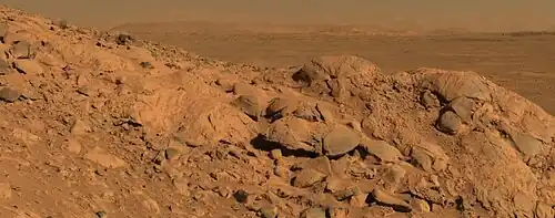 Entre as descobertas pelo Rover Opportunity está a presença de hematita em Marte na forma de pequenas esferas em Meridiani Planum. As esferas têm apenas alguns milímetros de diâmetro e acredita-se terem sido formadas como depósitos rochosos sob água há milhares de milhões de anos. Outros minerais encontrados continham formas de enxofre, ferro e bromo, tais como jarosita. Esta e outras evidências levaram que cientistas concluíssem que "a água líquida foi outrora presente de forma intermitente na superfície marciana em Meridiani, e por vezes saturava a sub-superfície. Porque a água líquida é um pré-requisito chave para a vida, Meridiani pode ter sido habitável por algum período de tempo na "História marciana". No lado oposto do planeta, o mineral goethita forma-se somente em presença de água, ao contrário da hematite. Outras evidências de água foram encontradas pelo Rover Spirit nas "Colinas Columbia".