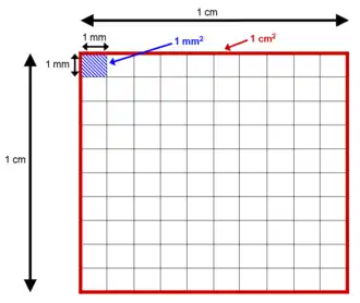 Cada unidade de comprimento tem uma unidade de área correspondente, igual à área do quadrado que tem por lado esse comprimento. Desta forma, as áreas podem ser medidas em metros quadrados (²), centímetros quadrados (cm²), milímetros quadrados (mm²), quilómetros quadrados (km²), pés quadrados (ft²), jardas quadradas (yd²), milhas quadradas (mi²), e assim por diante. Algebricamente, estas unidades são os quadrados das unidades de comprimento correspondentes.
