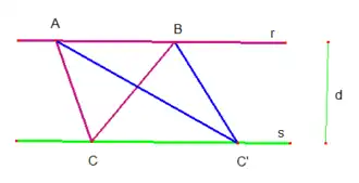 Assim, como e a distância de a dada por , se e pertencem a reta e pertence a reta , obtendo um ponto qualquer sobre a reta , temos , portanto os dois triângulos e possuem a mesma base e a mesma altura , logo suas áreas são iguais.